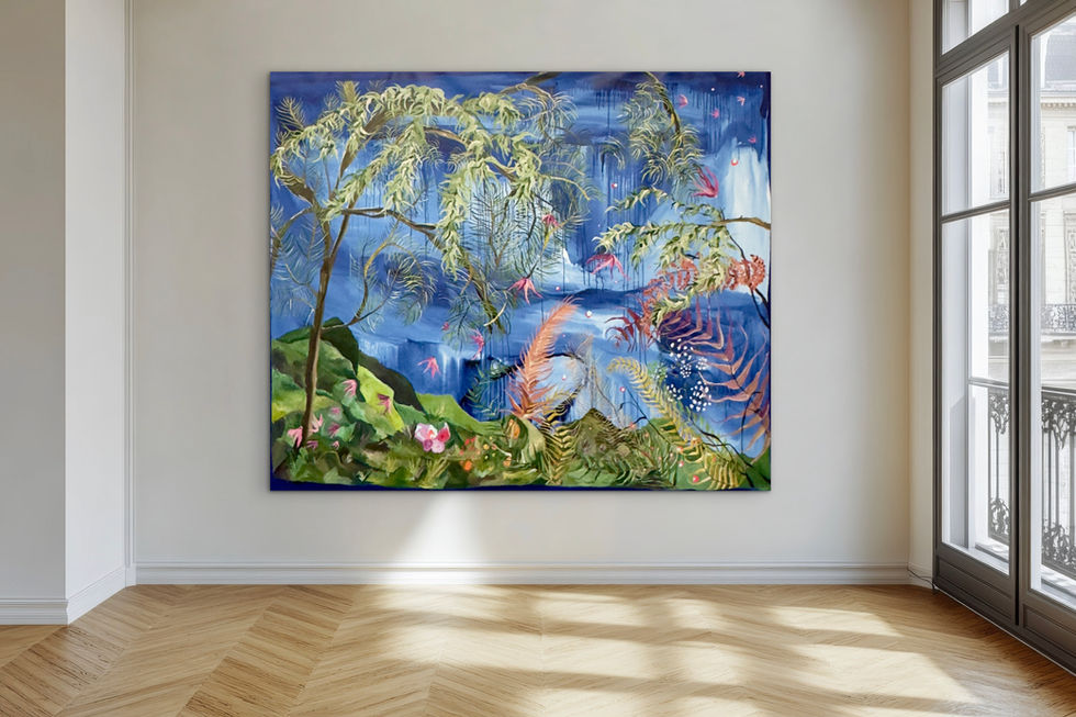 This painting is a tribute to my lover, to all lovers—to music, devotion, and the moments that carry us back to who we've always been. As I painted, flowers spread their seeds across the canvas, giving themselves back to the earth—guided by lyrics from Woody Guthrie, sung by Billy Bragg and Wilco: "We can build a house where our flowers come to bloom." So I ask you—where is your mountain bed?